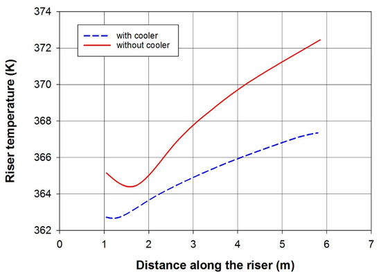 Temperature profile across the length of the riser in the presence and the absence of a cooler in the riser. Coolant and fresh feed inlet temperature is 360 K.