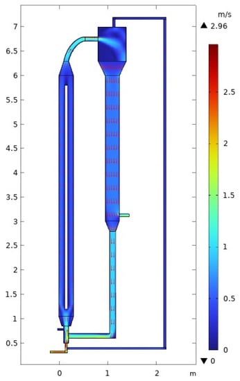 Velocity profile across the MZCR. The arrows display the velocity profile proportional to the velocity. Inlet gas velocity of 3 m/s.