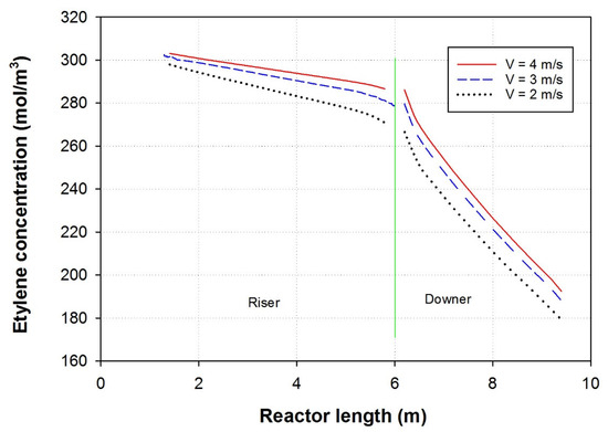 At the inception of the process, ethylene is introduced at the lowermost part of the riser, characterized by a predetermined concentration of 0.325 mol/L. This incoming ethylene stream subsequently combines with unreacted recycled ethylene and ethylene accompanied by polymer powder. As a result, there is a marginal increase in ethylene concentration just before it enters the riser, where the actual polyethylene formation takes place throughout the reactor. Figure 5 displays the ethylene concentration profile along the river and downer. This graphical depiction provides a comprehensive view of the distribution and concentration levels of ethylene across the reactor’s length at various riser velocities. The figure presents a line graph illustrating the variations in ethylene concentration along the entire length of the riser. The combined insights from both figures offer a deeper understanding of the progression and distribution of ethylene concentration throughout the riser reactor. It allows for a comprehensive analysis of the reaction dynamics and aids in optimizing process parameters for efficient polyethylene production. As the velocity increased ethylene concentration in both riser and downer increased. That is attributed to the decrease in ethylene residence time and the consequent decrease in ethylene consumption [34,35]. With a shorter residence time, ethylene molecules have less time to react and get consumed in the polymerization process. As a result, the overall ethylene consumption in the reactor decreases. This indicates that the higher gas velocities, the polymerization reaction occurs more rapidly, leading to an increase in ethylene concentration, but at the same time, each single ethylene molecule spends less time in the reactor, resulting in reduced ethylene consumption overall [36].