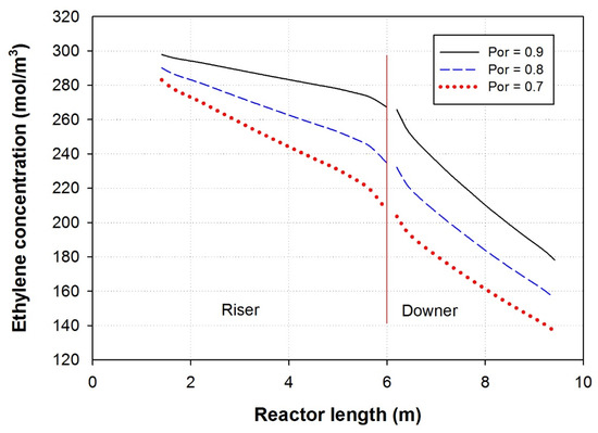 Ethylene concentration along the length of the MZCR at various riser porosity.