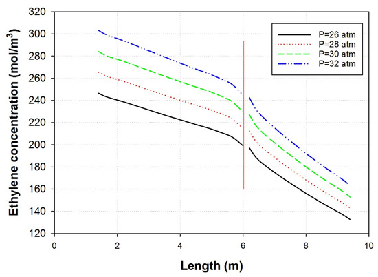 Figure 8 shows the effect of pressure on the riser and the downer of the MZCR. The figure shows that the increase in pressure increases the ethylene concentration in the reactor and hence helps in increasing the reaction rate and the production of polyethylene. In general, Figure 8 illustrates how higher pressure can positively affect the performance of the MZCR. By adjusting the pressure, we can optimize the reactor to produce polyethylene and improve efficiency. However, it is worth noting that excessive pressure increases may not always yield benefits and could introduce challenges that require careful consideration during reactor design and operation.