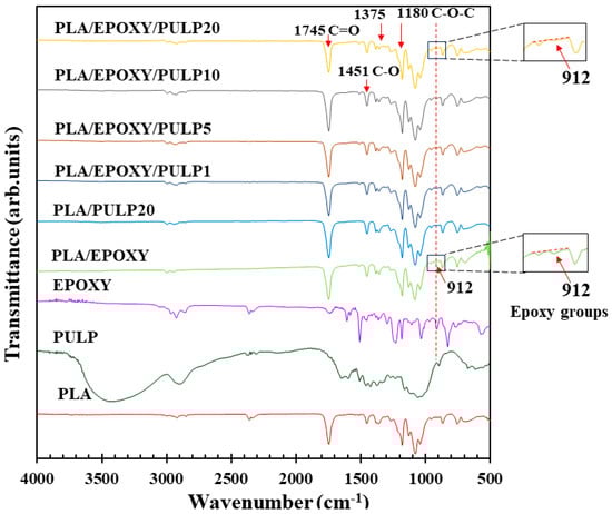 | PLA/EPOXY/PULP5 | 51 | 93 | 161 | 15.8 | 30.2 | 17.2 |