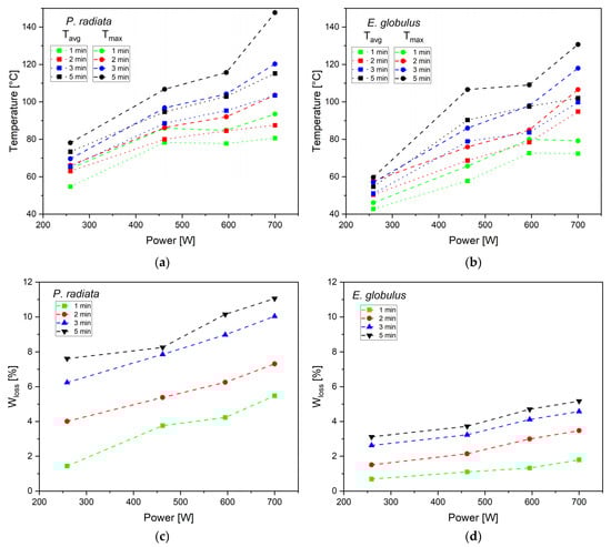 Average (Tavg) and maximum (Tmax) temperatures reached by the biomass samples vs. power for (a) PR and (b) EG; and weight loss (Wloss) vs. power for (c) PR and (d) EG.