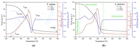 TG, DTG, and D2TG for (a) Pinus radiata (b) Eucalyptus globulus.