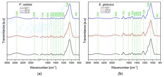 Figure 3 shows the FTIR spectra of Pinus radiata and Eucalyptus globulus. The analysis of absorption bands was conducted in the wavelength range from 3600 cm−1 to 800 cm−1, as such a range exhibits the highest changes after MW pretreatment. Seeking clarity, the discussion focus on two sub-regions (i) from 3600 cm−1 to 2800 cm−1 and (ii) from 1800 cm−1 to 800 cm−1. The former includes O-H and C-H stretching bands at 3400 cm−1 and 2800 cm−1, respectively. The second is assigned to different stretching vibrations of other groups from cellulose, hemicellulose, and lignin in the range of 1800–800 cm−1 [62].