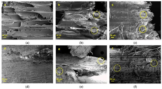 Additionally, the non-thermal effect dominates the microwave heating process, forcing polarised side chains of large molecules in the cell wall to break their hydrogen bonds, altering the structure [74]. It is also observed that there is a greater disorder on the surface of EG treated with a 700 W microwave for 5 min (Figure 4f) compared to the surface of PR under the same treatment conditions (Figure 4c) because softwoods are more resistant to microwave irradiation than hardwoods. This is because EG has a higher cellulose content (53.0%) than PR (43.1%), and during the pretreatment, crystallinity is reduced, depolymerising cellulose by breaking hydrogen bonds and disrupting the crystalline arrangement of cellulose molecules [76].