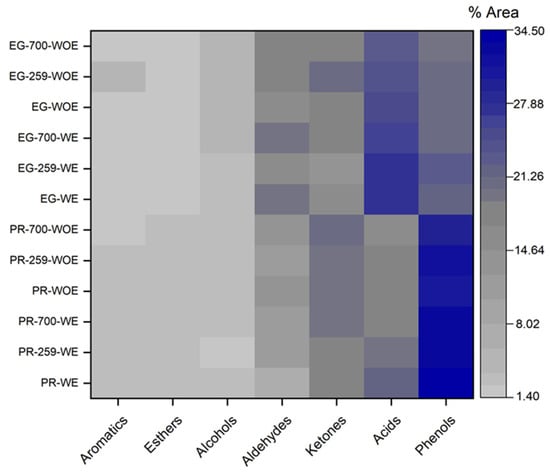 The biomass fast pyrolysis was carried out in an analytical micro-pyrolysis reactor (Pyroprobe 5200HPR, CDS Analytical Co., Ltd., Oxford, PA, USA) connected in line with a gas chromatograph equipped with a mass spectrometer system, GC/MS (Clarus 690, QS8. Perkin Elmer, Waltham, MA, USA). The pyrolysis reactor consisted of a quartz tube heated by a platinum filament. Approximately 0.5 ± 0.1 mg of each sample was accurately weighed by a microbalance (AD 6000 Ultra MicroBalance Perkin Elmer). According to previous analyses, the experiments were conducted at 550 °C to guarantee maximum biomass decomposition and to achieve the highest pyrolysis oil yield [5]. He (pure 99.996%, BOC ICONSA, Concepción, Chile) was used as a carrier gas. Compound identification was performed using the NIST 2017 library and TurboMass 6.1.0 software. The pyrolysis experiments were analysed for biomass samples with extractables (WE) and without extractables (WOE).
