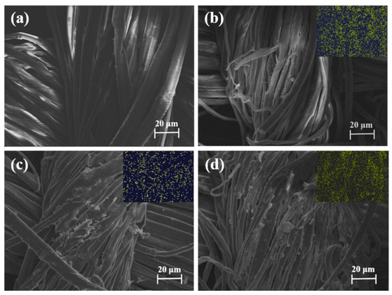 To confirm whether the modification process was successful, SEM and EDS were characterized to analyze the uncoated (RF-0) and coated fabrics (RF-1, RF-2, and RF-3). Figure 2 presents the SEM pictures of the four kinds of fibers. The surface of the uncoated fabric was smooth and flat, as shown in Figure 1a. The SEM images in Figure 2b–d clearly show that FPD particles were deposited on the surface of ramie fibers. We further used EDS mapping to investigate the element distribution of FPD-treated ramie fabric. In summary, the above results confirm that FPD was successfully coated onto the ramie fiber.