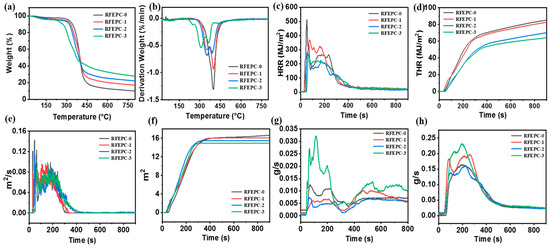 TGA (a) and DTG curves (b), HRR (c), THR (d), SPR (e), TSP (f), COP (g), and CO2P (h) and curves for composites.