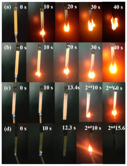 Further assessment of the flammability of the ramie/epoxy resin composites with different loading of FPD was conducted by vertical burning test. The obtained data and images are collected in Table 3 and Figure 7. Since ramie and epoxy resin are flammable materials, RFEPC-0 was completely consumed during the UL-94 tests, and no rating was obtained. Things changed better in the presence of 20% FPD, but it was still inhibited to some extent, and the flame retardancy was not enough to extinguish fire itself. It was noticed that RFEPC-3 self-extinguished within 10 s after the second fire was removed, rarely producing smoke during the combustion process, which indicates that FPD imparts to the composite high-flame retardancy property.