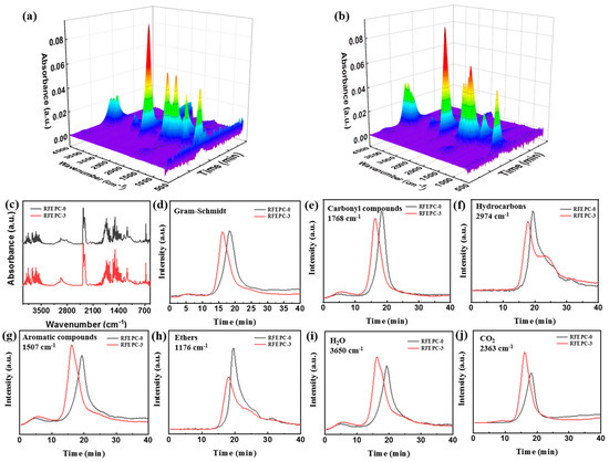 TG-FTIR 3D spectra for RFEPC-0 (a) and RFEPC-3 (b); FT-IR spectra of pyrolysis products for RFEPC-0 and RFEPC-3 at maximum decomposition rate (c); intensity of pyrolysis products (total (d), carbonyl compounds (e), hydrocarbons (f), aromatic compounds (g), ethers (h), H2O (i), and CO2 (j) versus time for RFEPC-0 and RFEPC-3.