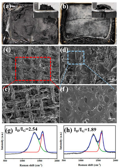 The vertical and the horizontal views of the char residue of RFEPC-0 (a) and RFEPC-3 (b) after the cone calorimeter test; SEM micrographs of char residue of RFEPC-0 (c,e), and RFEPC-3 (d,f) under different magnificent; and Raman spectra of residual chars for RFEPC-0 (g) and RFEPC-3 (h).