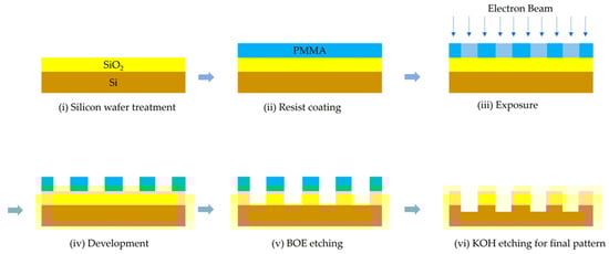 - The polymethyl methacrylate, PMMA 950K-A2 (2% PMMA molecular weight of 950,000 g·mol−1) was diluted in anisole. Anisole was used as a solvent for PMMA due to its ability to dissolve the polymer effectively. The dilution ratio was 1:1. Then, PMMA–anisole solution was coated on silicon wafer via spinning process. On the first layer, PMMA was spin-coated onto the surface of silicon wafer at 500 rpm for 10 s. Then, the second layer was operated at 1500 rpm for 40 s to increase the thickness of PMMA. The spun wafer was heated at 180 °C with heating time around 5 min to achieve the 80 nm thickness of photoresist film;
