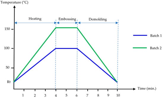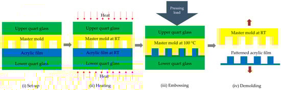 - In the heating stage, the set-up of an acrylic film and master mold was placed in the micro-embossing machine. They were heated from room temperature (RT) to 100 °C and 150 °C. The heating time was about 4 min;