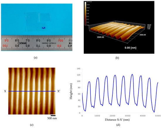The morphology of the nanogroove patterns on a 100-µm-thickness acrylic film after the micro-embossing process at 150 °C was characterized, as shown in Figure 8a. There, (b) presents a three-dimensional AFM topography image, (c) illustrates a top view of the nanogroove pattern, and (d) height profile. The results show that the series of parallel grooves are shown to be transferred onto the surface of a 100-µm-thickness acrylic film. It was also revealed that the average distance between the peak of the nanogrooves was approximately 500 nm, the average height of the grooves was approximately 105 nm, and the average width of the grooves was about 180 nm. In addition, the morphology of the nanogroove patterns on a 188-µm-thickness acrylic film after the micro-embossing process at 150 °C was characterized, as shown in Figure 9: (a) shows the micro-embossing of a 188-µm-thickness acrylic film. Then, (b) presents a three-dimensional AFM topography image, (c) illustrates a top view of the nanogroove pattern, and (d) height profile. The results show that the series of parallel grooves are transferred onto the surface of a 188-µm-thickness acrylic film. It was also revealed that the average distance between the peak of the nanogrooves was approximately 510 nm, the average height of the grooves was about 87 nm, and the average width of the grooves was about 200 nm. It was also observed that the crests between the grooves formed straight edges. The slipping of nanogroove patterns did not occur.