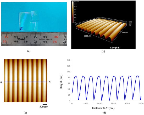 Over the last few years, nanostructures on acrylic film have attracted significant attention owing to their numerous potential applications. Nanostructures on acrylic film have stimulating effects on the physical and biophysical behavior of the cells that adhere to the surface []. Various designs of structures on acrylic films, such as nanopillars [,,], nanogrooves [,,], and nanopores [,,] on a nanometer scale have been presented in a wide variety of biomedical devices. Nanostructures on the surfaces of some materials can effectively regulate the adhesion [,], migration [], proliferation [], and other behaviors of bacteria and viruses. Nanogroove patterns on poly(methyl methacrylate) (PMMA) and polydimethylsiloxane (PDMS) film is a powerful device for increasing cell adhesion properties for medical devices with nanoscale features. Cell elongation, alignment, and proliferation were significantly controlled by the nanogroove-patterned surface []. Furthermore, the nanoimprinted polymer solar cell represents a promising and innovative approach in the field of renewable energy and photovoltaics. Through the use of nanoscale patterning techniques, such as nanoimprint lithography, the solar cell’s active layer can be structured with precision, enhancing light absorption and increasing overall device efficiency [].