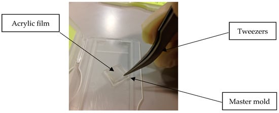In this study, the micro-embossing process requires using master mold for replication. However, the fragile nanogrooves on the master mold were easily damaged during the demolding stage [,]. Fractures that occur in the nanopattern of the master mold mean obtaining an incomplete copy of the nanogrooves on acrylic film. Therefore, an embossed acrylic film in the master mold was turned out of the micro-embossing machine after the embossing step and cooled to room temperature. Then, an embossed acrylic film was carefully peeled out of a master mold using the nib tweezers, as shown in Figure 10. The result shows that an embossed acrylic film was easily removed from the master mold.