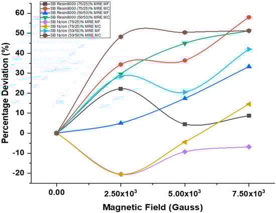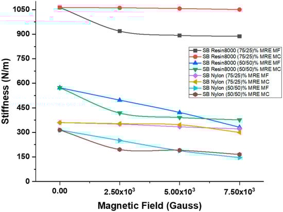 | Sandwich Beam Sample | Magnetic Field (Gauss) | Stiffness MF (N/m) | Deviation (%) | Stiffness MC (N/m) | Deviation (%) |