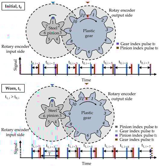 The measurement principle developed at the LKT is similar to a single-flank rolling test. However, instead of directly evaluating the angular displacement between pinion and gear, the index pulses of the rotary encoders on the input and output shafts are evaluated. This enables measurement at high operating speeds with high resolution. The idea behind the concept is that progressing wear and deformation of the plastic gear leads to a delay in the index pulse of the plastic gear on the output side. The steel pinion remains unchanged; thus, the time period between the input and output index pulses increases (t0 < t1), as shown in Figure 3.
