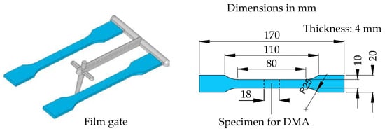For the DMA, an injection-molded tensile bar type A according to DIN EN ISO 3167 [27], also created from PBT Ultradur B4520 by BASF AG, Ludwigshafen, Germany, was used. The specimen for the DMA was cut out of the middle of the tensile bar. The dimensions of the tensile bar and the specimen for the DMA are shown in Figure 4, as shown below. The DMA specimen is 18 mm long, 10 mm wide and 4 mm thick.