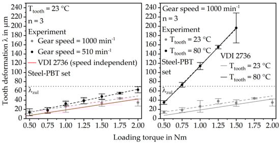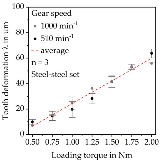 At a rotational gear speed of 510 min−1 the average tooth tip deformation is 13.8 ± 7.5 µm, which is approximately the same as at 1000 min−1 rotational speed. However, it increases roughly linearly up to 62.9 ± 6.7 µm, which is approximately 50% higher than the calculated results and significantly higher than the deformation at 1000 min−1 gear speed. Moreover, the deformation is already within the range of the maximum allowed deformation λzul = 70 µm according to VDI 2736 part 2 (Equation (2)) at a loading torque of 2.00 Nm.