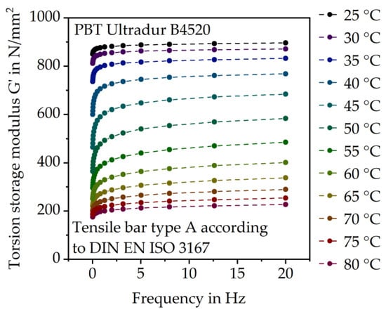 Torsion storage modulus G’ of PBT Ultradur B4520 depending on the load frequency at different temperatures.