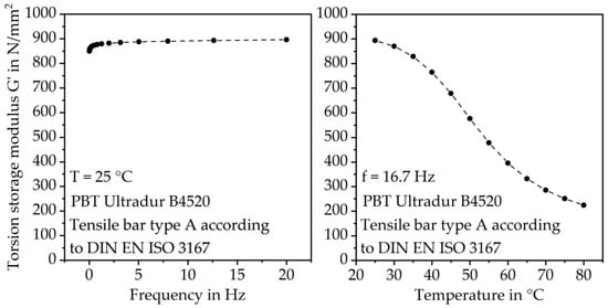 With increasing temperature, the torsion storage modulus G’, which corresponds to the elastic modulus, decreases severely, according to the DMA results. G’ increases with higher frequency. The effect of the load frequency on G’ is especially prominent at low frequencies between 0 Hz and 3 Hz and around the glass transition temperature Tg (between 40 °C and 60 °C). The DMA results also show that the effect of temperature on the elastic material behavior is significantly higher than the effect of frequency, as shown in Figure 8.