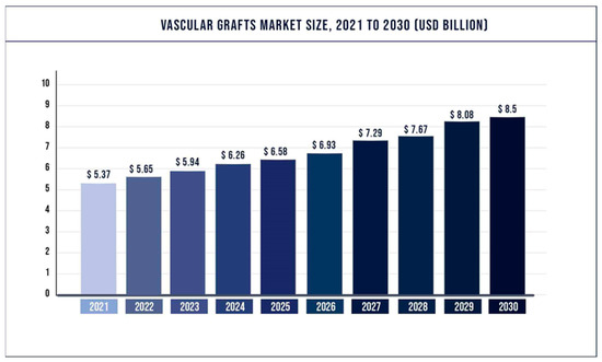 Firstly, the growing number of cardiovascular disease patients, with over 600,000 vascular implants reported annually in the United States alone, highlights the need. The global vascular grafts market, valued at USD 5.37 billion in 2021, is projected to reach USD 8.5 billion by 2030 (Figure 1). With the increasing incidence of cardiovascular diseases, this market is expected to grow at a Compound Annual Growth Rate (CAGR) of 5.24% from 2022 to 2030.