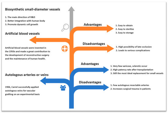 This figure provides a visual representation of the evolution in materials used for vascular grafts. It traces the progression from autologous arteries or veins to artificial blood vessels, and finally to the current focus of research—biosynthetic small-diameter vessels, such as those fabricated from bacterial cellulose. This diagram offers a clear comparison of the advantages and disadvantages associated with each material.