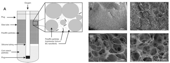 This figure provides a comprehensive view of the impact of different treatment conditions on the pore sizes of bacterial cellulose (BC). (A) A schematic representation of the fermentation unit, demonstrating how paraffin granules float in the medium, while starch granules sink. This configuration encourages bacteria to generate a tangled network of BC on and between the pellets, proximal to the silica tube [85]; (B) Scanning electron microscope (SEM) imagery detailing the external surfaces of BC tubes produced under varying conditions: (i) BC cultured without any porosity agents, (ii) BC cultured in the presence of potato starch, (iii) BC cultured with paraffin, and (iv) BC cultured with fused paraffin pellets. The circled areas in (iii) highlight regions between the pores [85].