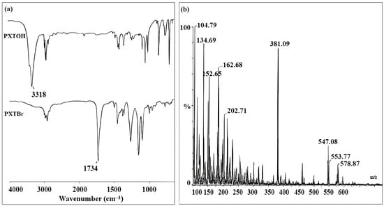 (a) FT-IR spectra of (PXTOH) and (PXTBr), (b) ESI mass spectrum of (PXTBr).