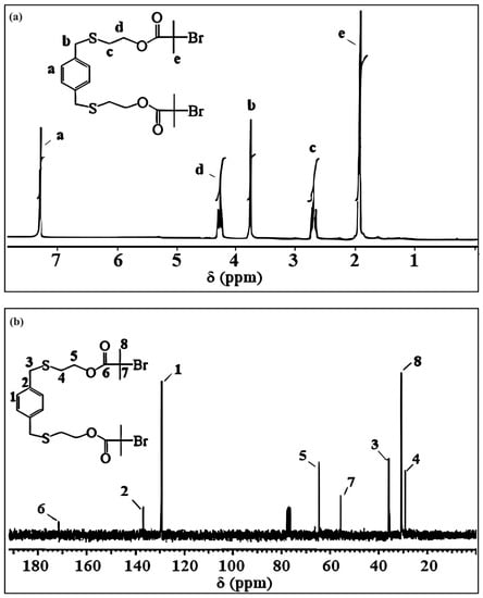 The 1H NMR and 13C NMR spectra of PXTBr, along with assignments, are shown in Figure 2. In the 1H NMR spectrum (Figure 2a), the peak at δ = 2.24 ppm, corresponding to the primary –O–H groups’ protons, disappeared in comparison to the 1H NMR spectrum(data) of PXTOH. The protons (He) of methyl groups (C(Br)(CH3)2) appeared as a singlet at δ = 1.93 ppm as a result of esterification in PXTBr (Figure 2a). Hill et al. showed that the protons (He) of the methyl groups (C(Br)(CH3)2) occured singlet at δ = 1.93 ppm as a result of esterification of the difunctional initiator [71]. The triplets appearing at δ = 4.27 and 2.69 ppm in the spectrum (Figure 2a) were assigned to methylene protons (SCH2CH2O) and (SCH2CH2O), respectively. The spectrum also gave signals at δ = 3.67 ppm for benzylic (ArCH2S) and at δ = 7.28 ppm for the aromatic protons of PXTBr. As seen in Figure 2b, the 13C NMR spectrum of PXTBr clearly indicated the presence of carbonyl, quaternary, and methyl carbon atoms of the bromoisobutyryl end group at δ = 171.4 (C6) (C=O), 55.5 (C7) (C–Br(CH3)2, and 30.7 (C8) (C–Br(CH3)2), respectively. The aromatic carbon signals of PXTBr were observed at 129.2 (C1) and 136.8 (C2) ppm. 13C NMR spectra also indicated the methylene carbon signals of the PXTBr were at 64.5 ppm (SCH2CH2O), 35.9 ppm (ArCH2S), and 29.2 ppm (SCH2CH2O) (Figure 2b). All spectral data were in good agreement with the novel synthesized ATRP initiator (PXTBr).