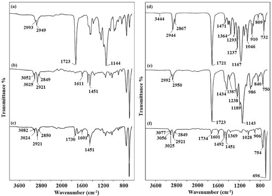 FT-IR spectra of the macroinitiators and block copolymers. (a) PXTPMMA, (b) PXTPS, (c) PXT(PS-b-PMMA-b-PS), (d) PXTPCLOH, (e) PXT(PMMA-b-PCL-b-PMMA), (f) PXT(PS-b-PCL-b-PS).