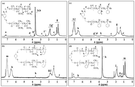 1H NMR spectra of macroinitiators and their block copolymers (PM-1), (PS-1), (ABA–1), and (ABA–2) are indicated in (a), (c), (b), and (d), respectively.