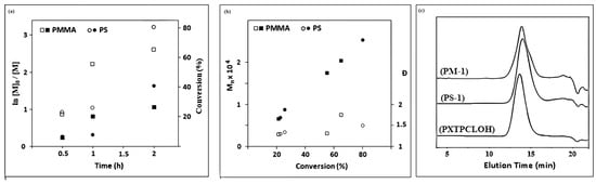 Kinetics studies of ATRP of MMA and S using PXTBr as the initiator with [MMA or S]:[I]:[CuBr]:[PMDETA] = 100:1:2:2 in bulk at 90 °C were carried out. The constant concentration of active species during polymerization was proved by the linear relationship between ln [M]0/[M] and time (Figure 5a). The linearity of the plot of molecular weight (Mn,GPC) vs. conversion percentage and polydispersity index for both macroinitiators also demonstrated controlled polymerization behavior. The semilogarithmic kinetic plots of ln([M]0/[M]) versus time for ATRP of MMA and S using PXTBr as initiator in bulk are presented in Figure 5b. GPC curves of PMMA and PS macroinitiators (PM-1 and PS-1) (in 0.5 h) showed low Đs (<1.35) and narrow unimodal Mn distributions (Figure 5c).