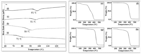 DSC traces and TGA curves of PXTPMMA and PXTPS macroinitiators and their block copolymers. (a) PXTPMMA, (b) PXTPS, (c) PXT(PMMA-b-PS-b-PMMA), (d) PXT(PS-b-PMMA-b-PS), (e) PXTPMMA, (f) PXTPS, (g) PXT(PS-b-PMMA-b-PS), (h) PXT(PMMA-b-PS-b-PMMA).