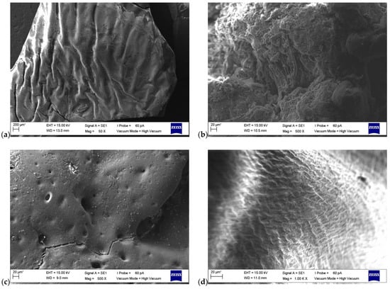 SEM images of the macroinitiators and the block copolymers are given in Figure 7a–d. From the SEM image of PXTPMMA (Figure 7a), the two-armed branched PMMA blocks are a homogeneous arrangement on the surface. At the same time, there are folds and crevices on the surface. The surface shows a smooth and regular chain arrangement in some regions. SEM microfilm of PXTPS (Figure 7b) shows that the PS blocks in the macroinitiator branch on the surface are relatively short, two-armed blocks. There are very small micropores in this polymeric structure. On the surface, the branching resembles the distribution of spherical micelles, but this distribution is not homogeneous and regular. In Figure 7c, it can be seen that the surface film of PXT(PMMA-b-PS-b-PMMA) is rough and has macro- and micropores. SEM microfilm of the PXT(PS-b-PMMA-b-PS) block copolymer is given in Figure 7d. In the SEM image of PXT(PS-b-PMMA-b-PS), the block copolymer surfaces show sharp, curved, fibrous shapes. These filamentous chains are arranged horizontally and vertically on the surface.