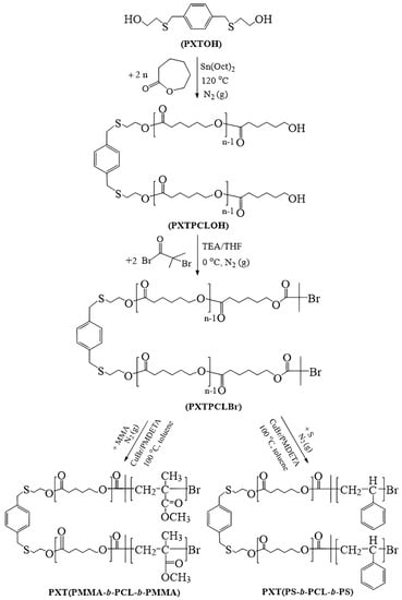 Triblock copolymers were synthesized by chain extension of PS, PMMA, or PCL macroinitiators initiated by the novel ATRP (PXTBr) and ROP (PXTOH) initiators. Firstly, PXT(PS-b-PMMA-b-PS) and PXT(PMMA-b-PS-b-PMMA) ABA–type triblock copolymers were synthesized in four steps: the synthesis of diol compounds (PXTOH) (i), a novel bifunctional ATRP initiator (PXTBr) (ii), PMMA and PS macroinitiators (PXTPMMA and (PXTPS) (iii), and ABA–type triblock copolymers (iv). In the first step, (PXTOH) was synthesized according to the literature [69] by the reaction of α,α’-dichloro-p-xylylene with 2-mercaptoethanol in the presence of KOH/ethanol media. In the second step, a novel bi-functional initiator (PXTBr) was prepared by the esterification of α-bromoisobutryl bromide with PXTOH for ATRP initiation. In the third step, PMMAs and PSs as macroinitiators were prepared via ATRP with a CuBr/PMDETA catalyst system initiated by compound PXTBr. In the final step, these macroinitiators were used to obtain ABA-type block copolymers by the ATRP method.