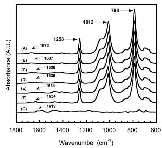 ATR FT-IR spectra of PSX750/PBA-a blends at different benzoxazine contents: (A) Pure PSX750, (B) 10%, (C) 20%, (D) 30%, (E) 40%, (F) 50%, and (G) pure PBA-a.