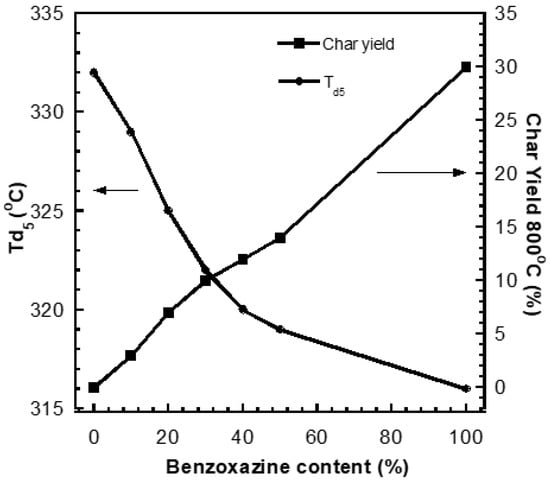 Thermal stability could inform the service temperature of materials. In general, the thermal stability values could be determined from the decomposition temperature at 5% weight loss (Td5) and char yield at 800 °C. From Figure 4, it could be seen that the addition of benzoxazine from 0–50 wt% could lead to an increase in char yield, i.e., an increase from 0 to 14 wt%. However, the Td5 values were decreased with the addition of benzoxazine, i.e., decreased from 332 to 319 °C. This could be attributed to the nature of pure polybenzoxazine, i.e., pure PBA-a provided char yield value of ca. 30 wt% and Td5 value of approximately 316 °C. The possible reason for the increase in char yield in the case of the blends at a higher content of benzoxazine is that the greater number of aromatic rings in the chemical structure of the benzoxazine portion led to the higher value of char yield [].