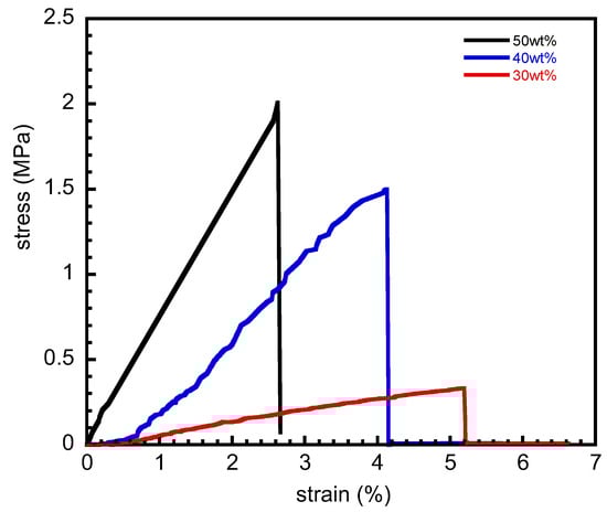 Stress–strain curves of the multiple-shape memory polymers at 30, 40, and 50 wt% benzoxazine contents.