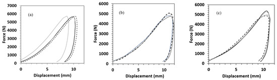 Force-displacment response of (a) Control, (b) VtC, and (c) BC after the impact drop tests on the composites.