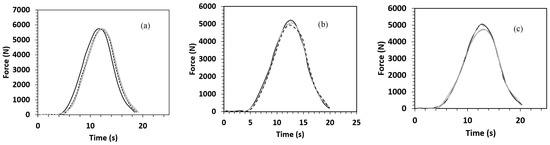 Force-time response of (a) Control, (b) BlC, and (c) VtC. after the impact drop tests on the composites.