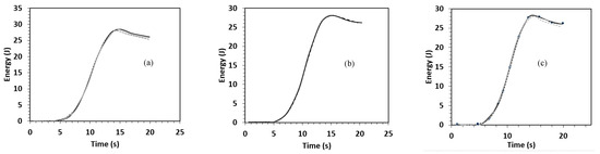 Energy-time response of (a) BlC, (b) VtC, and (c) BC after the impact drop tests on the composites.