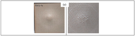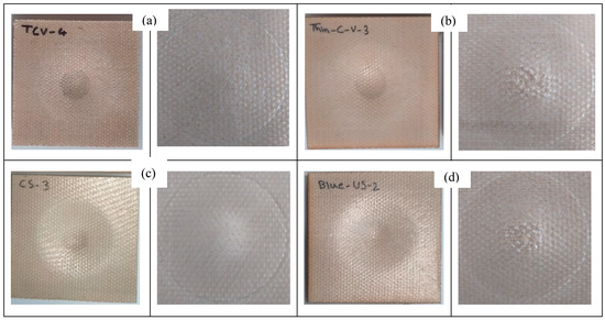 Force-displacement curves after the drop test for three of the laminates are exhibited in Figure 1a–c, and the summary of the results is shown in Table 3. A very similar relationship can be observed between the force and displacement of all the composite laminates. The highest peak force was recorded at ca. 5229 N for VTC amongst all four sandwich composites, which is attributed to its thicker PA core, followed by BC, BlCC, and VtC laminates, which showed the maximum force in the range between approximately 4893 N and 5121 N. Due to the presence of more ductile rayon fabric layers in the control composite, the peak force was found to be at a higher value (5687 N). All the composites were tough, and the incident energy of 15 joules did not make a dent in the samples, and no sign of perforation was detected. Therefore, 25 J of incident energy was introduced to all the composites, and the damaged images of the samples under this impact energy are illustrated in Figure 4 and Figure 5. As seen in Figure 4 and Figure 5, it was observed that the specimens did not delaminate and the drop weight did not penetrate, indicating their failure resistance through energy absorption and dissipation; however, it was detected that the samples were dented in a circular shape on both sides. The force-displacement curves showed the stable propagation of the damage to the samples, and the maximum displacements of all the composite laminates were not very far from each other, falling within the range between 13.01 mm and 14.30 mm. It is promoted that the maximum displacements (Table 3) are in good agreement with the bending displacements at maximum force for the sandwich composite systems. Ude et al. [21] produced sandwich composites with silk-woven epoxy skins together with honeycomb (density = 0.056 kg/m3) as well as polymeric foam (0.052 kg/m3) as core material. The composite specimens were tested under an incident energy of 48 J, and it was revealed that sandwich composites with the honeycomb core and foam recorded peak forces of 800 N and 900 N, respectively. Another investigation [22] was performed on the sandwich composites with flax fiber epoxy composite skins and high-density polyethylene bottle caps as core materials. The peak force obtained from the drop test under an incident energy of 50 J was 1900 N. Hachemane et al. [23] made jute fiber epoxy composite skins and bonded them to cork agglomerate cores to produce sandwich composites. Under the impact energy of 16 J, the sandwich composite containing cork agglomerate cores with densities of 270 kg/m3 and 310 kg/m3 was found to demonstrate a peak force of 2700 N and 2000 N, respectively. It is worth mentioning that the peak forces obtained from the sandwich composite specimens with PA cores in this study presented higher values than the above-mentioned ones collected from the literature.