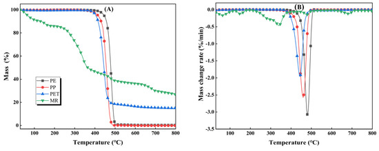 Pyrolytic behavior of MR, PE, PP, and PET: (A) TG curves; (B) DTG curves.