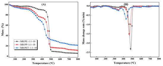 Pyrolysis characteristics of MR with the addition of PE, PP, and PET: (A) TG curves; (B) DTG curves.