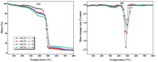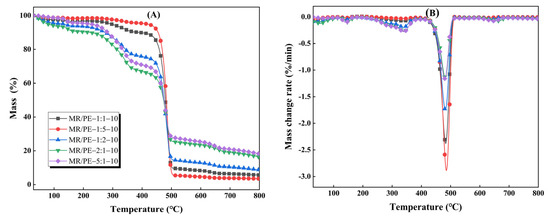 Characteristics of MR/PE co-pyrolysis under different mixing ratios: (A) TG curves; (B) DTG curves.