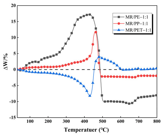 The variation of ∆W with the increase in pyrolysis temperature for MR/PE, MR/PP and MR/PET is shown in Figure 5. It is reported that ∆W greater or less than zero implies that there is a synergy between the individual components [18]. The ΔW values of MR/PE increased gradually (>0) with the increase of pyrolysis temperature in the temperature range from room temperature to 424 °C, indicating that the mass loss of MR/PE was severely hindered in this temperature range. The ∆W of MR/PE reached the maximum value of 17.22% at 424 °C. According to the TG result in Figure 1, this is mainly related to the fact that PE starts to soften and then encapsulate MR particles at lower temperature, resulting in a great inhibition of the release of MR/PE moisture and MR pyrolysis volatiles [33,34]. When PE starts to pyrolyze, the wrapping effect of PE is weakened, and large amounts of volatiles are released from the MR/PE, leading to a rapid decrease of ΔW to a negative value. The lowest value of −10.52% is found at 656 °C. The negative values of ΔW indicate that the interaction between MR and PE at the current temperature leads to the release of large amounts of volatiles from the mixture. It is worth noting that the MR/PE maintained relatively low ΔW values towards the end of the reaction (800 °C), indicating that a good synergistic interaction existed between MR and PE and their pyrolysis intermediates. This is consistent with the result that the solid residue of MR/PE is significantly lower than the theoretical one [30,35]. Similar to MR/PE, the ΔW of MR/PP also showed a tendency to increase first and then decrease, reaching its maximum value of 11.99% and minimum value of −2.13% at 460 and 682 °C, respectively. The difference between MR/PE and MR/PP is that the ΔW values of MR/PP were less than those of MR/PE throughout the pyrolysis process.