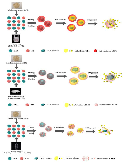 Therefore, to achieve rapid and efficient resource utilization of edible fungi residue, it is proposed to treat edible fungi residue by adding waste plastics for co-pyrolysis. Currently, related studies are relatively limited and the mechanism of the co-pyrolysis process is still unclear. Accordingly, this study took mushroom residue (MR) as a typical representative of edible fungi residue and blended it with plastic for pyrolysis. Conditions relating to the types of plastics (PE, PP, PET), the ratio of MR to plastics (5:1–1:5), and heating rate (10–40 °C/min) during the co-pyrolysis process were controlled. Thermogravimetric analysis (TGA) and kinetic models were used to analyze the pyrolysis parameters, interactions, and kinetic parameters of the pyrolysis process. This research will provide important theoretical guidance for the resource utilization of agricultural solid waste.